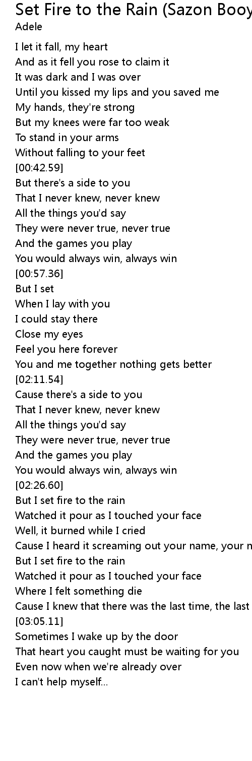 Listen to "Easy On Me" here: http://Adele.lnk.to/EOM Pre-order Adele's new album "30" before its release on November 19: . Set Fire To The Rain Lyrics are a theme that is being searched for and favored by netizens today. You can Get the Set Fire To The Rain Lyrics here. Download all royalty-free pic. Adele - Set Fire To The Rain LYRICS!, Adele - Set Fire To The Rain Album: 21 I do not own this song, no copyright infringement intended. thumbs up!! The font is Segoe .